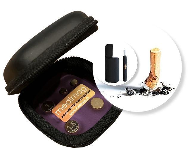 "Medimag" Box beinhaltet vergoldete, therapeutische Akupunkturmagnete welche auf dem Prinzip der Ohrakupunktur (Auriculotherapie) beruht. Der Rauchstopp basiert auf der Kombinationswirkung der klassischen Akupunktur zur Nikotinhemmung und der Förderung und Produktion von Endorphinen mit der zusätzlichen Magnet-Punktestimulation.